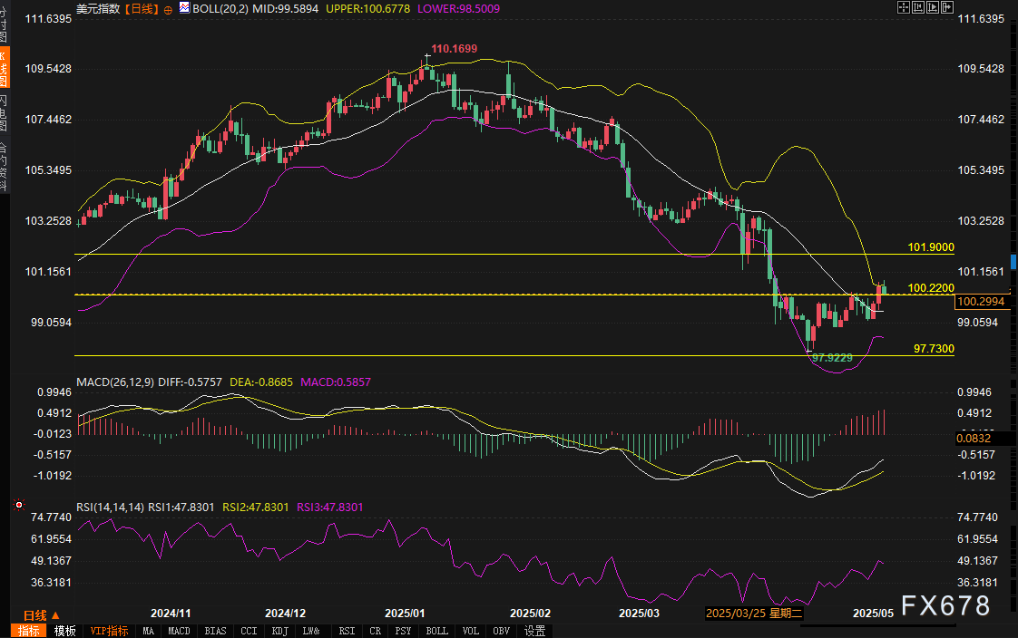 Pepperstone激石——周五(5月9日),美元指数在冲高至100.86后迅速回落,这一走势反映出市场对周末贸易谈判的谨慎情绪,叠加美联储官员密集讲话前的仓位调整。技术面上,布林带中轨99.5934与上轨100.6936形成短期压制,MACD柱状图虽仍处负值区间(-0.5695),但快慢线收敛迹象明显,显示多空博弈加剧。
