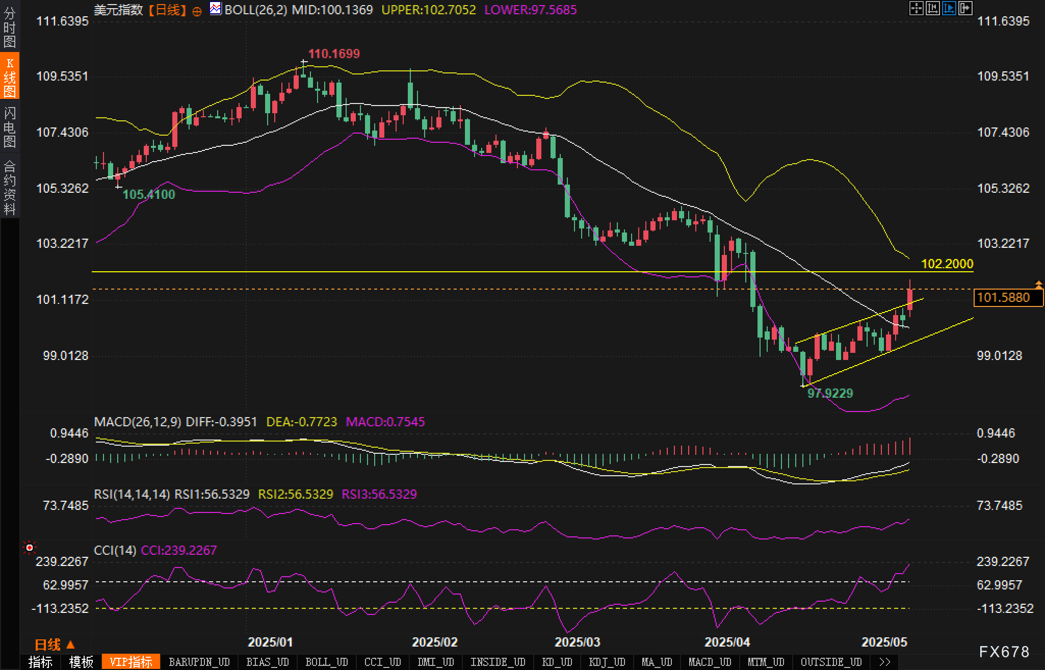 美元指数日线图显示,近期走势已进入显著的上升通道。从图表来看,价格自97.92低点触底反弹,形成一个清晰的上升楔形结构。当前价格已突破101.50这一关键水平,测试102.20的重要阻力位。
