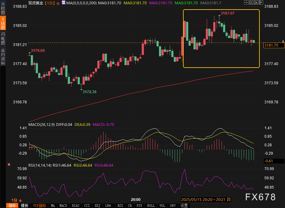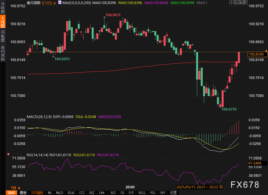 数据公布前,市场预期4月零售销售持平,PPI月率增长0.2%,初请失业金人数略增至22.9万。早间黄金自一个月低点3120美元/盎司反弹至3170美元附近,美元指数小幅回落13点至100.80左右,美股期货小幅走高,显示市场对数据结果持谨慎乐观态度。然而,20:30数据公布后,市场反应迅速且复杂,美元指数一度触及100.6755低点,随后反弹至100.7919,收复全部跌幅;黄金短暂冲高至3187.07美元/盎司后回落至3183.20美元;标普500和纳斯达克指数日内波动幅度不足0.3%,反映市场在消化数据与鲍威尔讲话的双重影响。