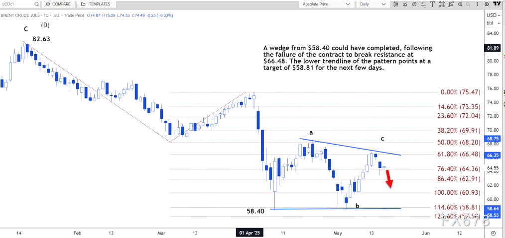 阻力位在65.05美元,突破该位可能推动价格上涨至65.69美元至66.38美元区间。日线图显示,由于该合约未能突破66.48美元的阻力位,自58.40美元开始的楔形可能已经完成。