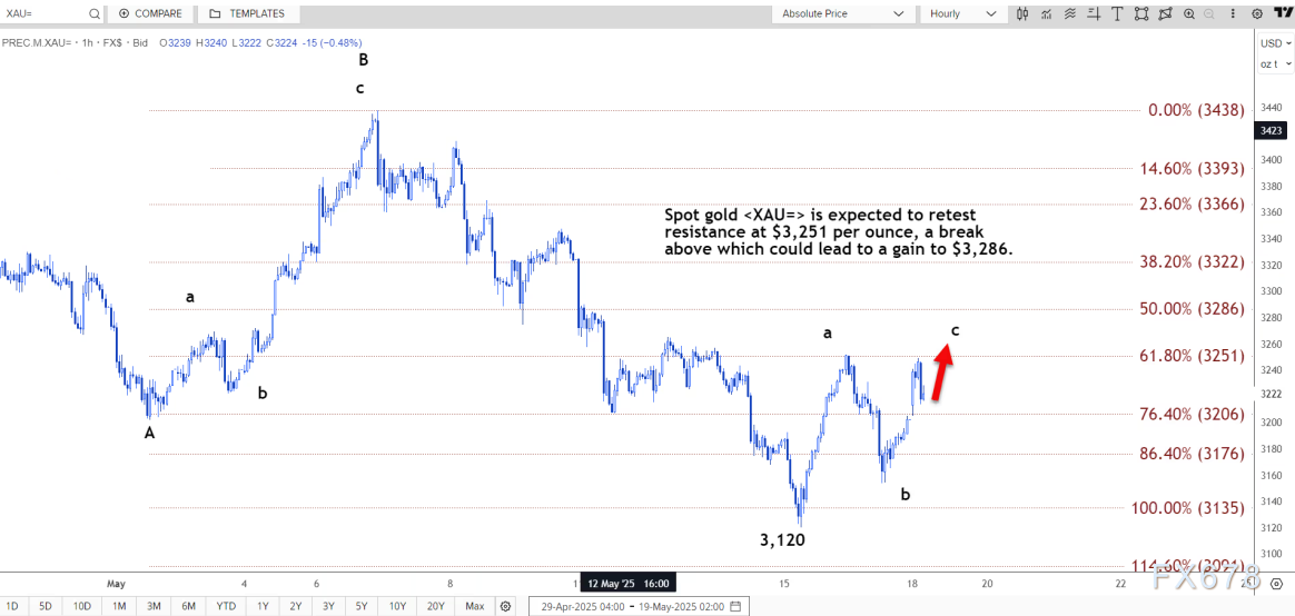 Pepperstone激石——周一(5月19日)亚洲时段,现货黄金震荡上涨,目前交投于3224.42美元/盎司附近,涨幅约0.7%。