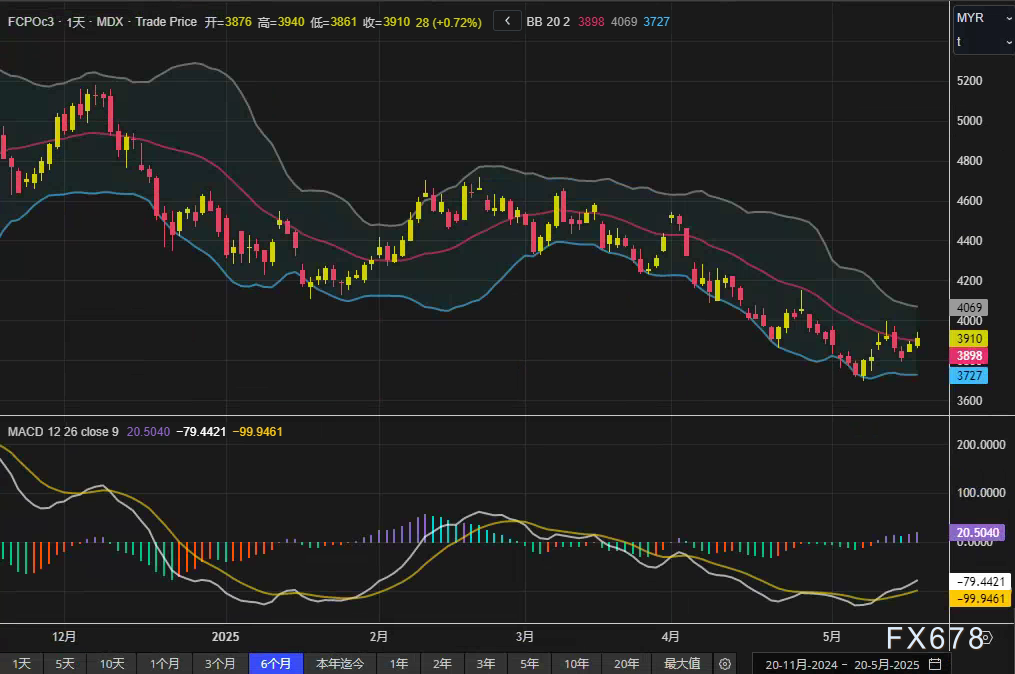 Pepperstone激石——周二(5月20日),马来西亚衍生品交易所(BMD)棕榈油基准合约FCPOc3(8月交割)收盘报3910林吉特/吨,单日上涨0.72%,约合910.36美元/吨,连续第二日收阳。 当前行情受大连棕榈油价格走强及芝加哥豆油隔夜上涨带动,市场情绪有所回暖,但供需基本面与外部因素交织,短期走势仍存不确定性。