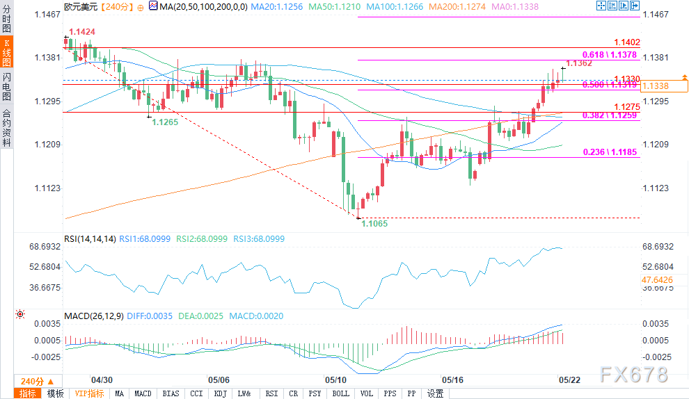 4小时图中,欧元兑美元看到了更高的高点,为看涨延续潜力奠定了基础。之前在1.1275附近的阻力现在可能成为支撑。