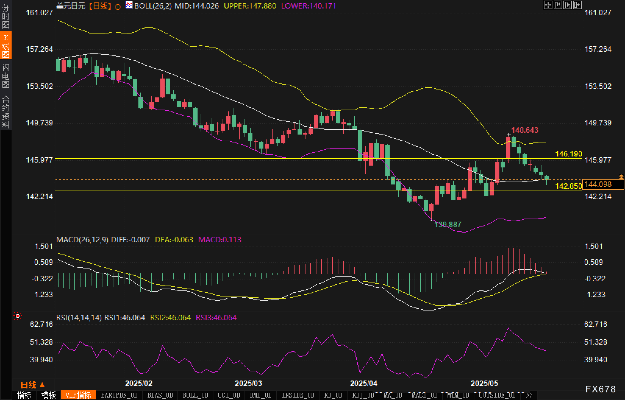 美元/日元日线图上可见明显的下降通道形态。当前价格144处于布林带中轨144.026附近,上轨147.880,下轨140.171,短期内下行压力占主导。