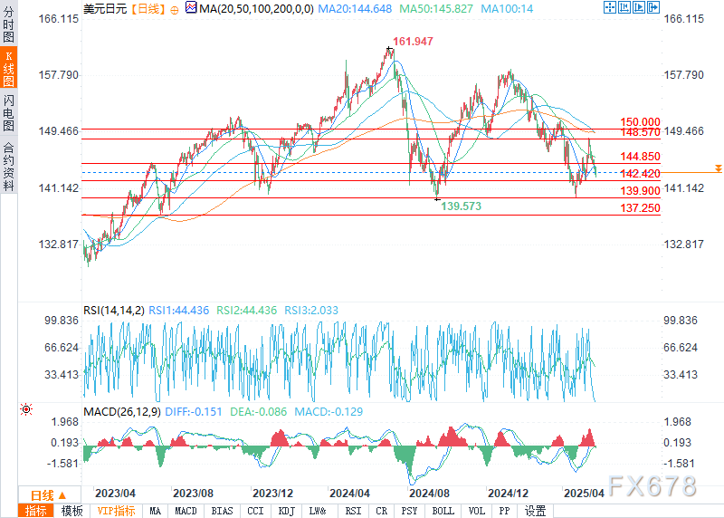 美元兑日元汇率跌破20日指数移动平均线(EMA)约144.85的水平,表明短期趋势偏空。
