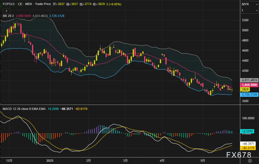 Pepperstone激石——周一(5月26日),马来西亚衍生品交易所(BMD)棕榈油期货呈现窄幅震荡走势。基准8月合约FCPOc3微涨2林吉特(0.05%),收报每吨3829林吉特(约合908.42美元)。盘面显示,布林带(20,2)上轨4011林吉特、中轨3869林吉特、下轨3726林吉特形成明确价格通道,MACD指标虽仍处负值区域(-82.6),但快慢线间距收窄至14.2,暗示市场正在寻找新的方向。
