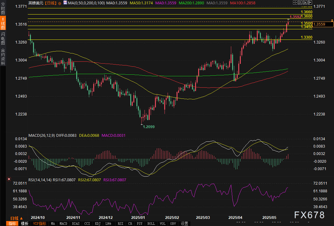 Pepperstone激石——周一(5月26日),英镑兑美元延续近期强势表现,亚欧时段一度逼近1.3600整数关口,刷新三年高位,随后小幅回落至1.3556附近,日内涨幅0.16%。美元指数则延续疲软走势,跌至98.70附近,创一个月新低。英镑的强势表现主要受到美元走弱和英国经济数据向好的双重支撑,但技术面超买信号值得警惕。