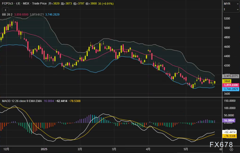 Pepperstone激石——本周二(5月27日),尽管市场普遍预期马来西亚棕榈油产量及库存将延续增长态势,但BMD棕榈油主力合约FCPOc3仍逆势收高。截至收盘,8月合约报3868林吉特/吨,单日涨幅0.91%,实现三连阳。技术面显示,布林通道中轨位于3859林吉特,MACD柱状图虽仍处负值区间(-78.5),但快慢线收敛迹象明显,短期或延续震荡格局。