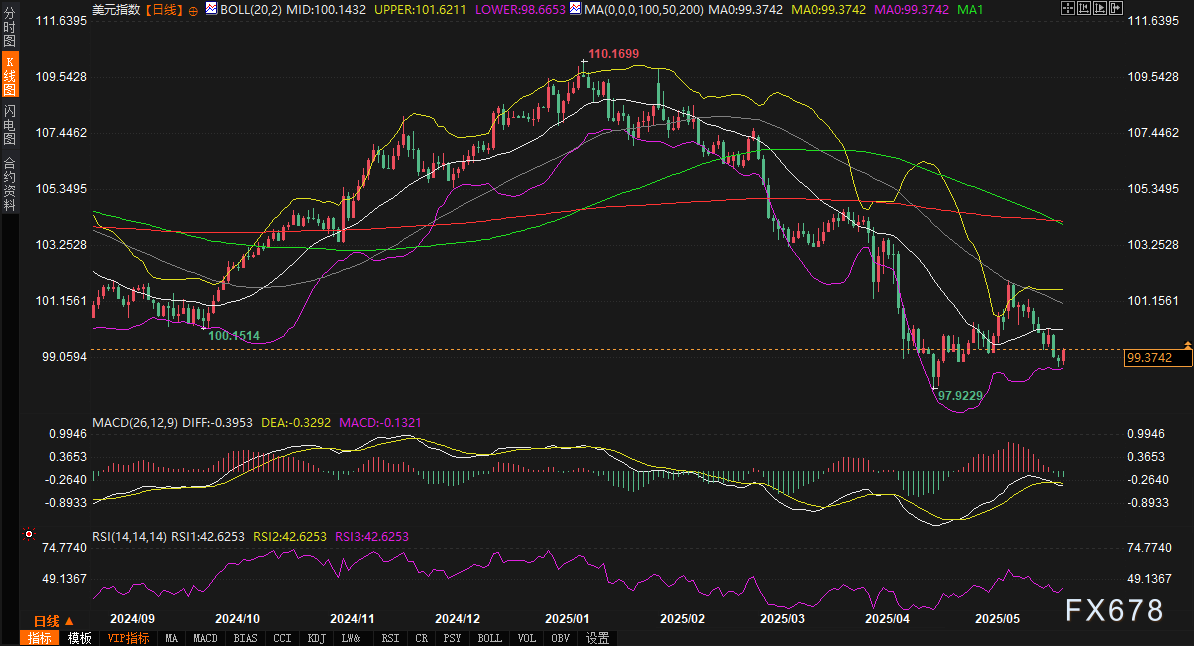 Pepperstone激石——周二(5月27日)欧洲时段,美元指数(DXY)交投于99.30附近,较前一交易日五周低点98.70反弹0.40%。此次回升主要受美债收益率下行及市场对特朗普政府财政政策的观望情绪驱动。然而,美元仍处于关键均线系统下方,50日、100日及200日均线分别位于101.09、104.04和104.18,中长期空头格局未变。