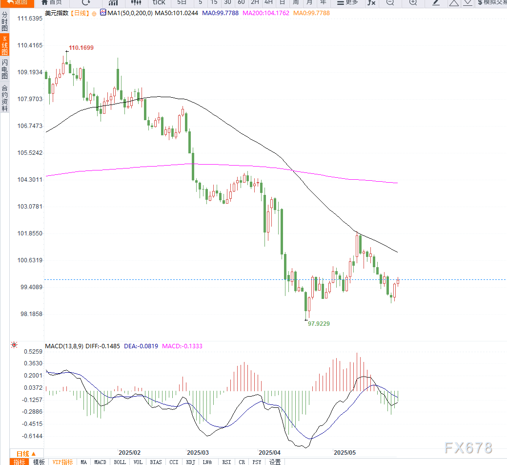技术面显示,美元指数短期突破99.50支撑后进入震荡反弹阶段,但100整数关口构成较强阻力,需等待美联储相关信息确认方向。