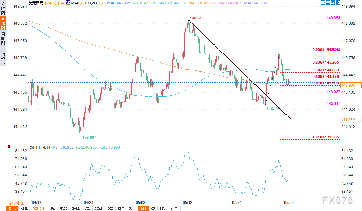 Pepperstone激石——周五(5月30日)欧盘时段,美元/日元最新价格围绕在143.922至144.275 附近波动,均价为143.917 。前期价格从较高位回落,显示出一定的下行压力。