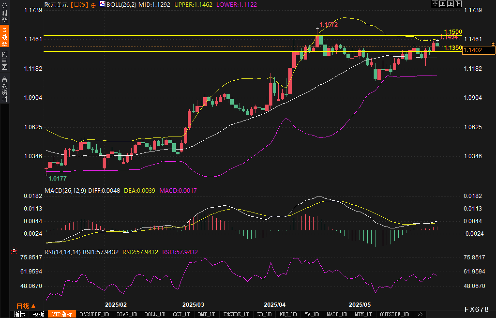 欧元兑美元当前运行在布林通道上轨与中轨之间,布林带带宽略有收窄,显示短期波动率有所下降,行情处于整理态势。当前中轨支撑位在1.1292,汇价短期内多次测试该区域未见有效跌破,技术上形成一定支撑。