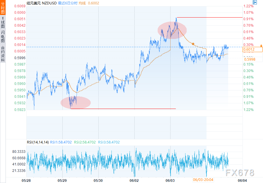 Pepperstone激石——周三(6月4日)欧盘时段,纽元/美元分时图上价格有明显波动,呈现多波上涨与回调。均线在 0.6011 附近,相对平稳。