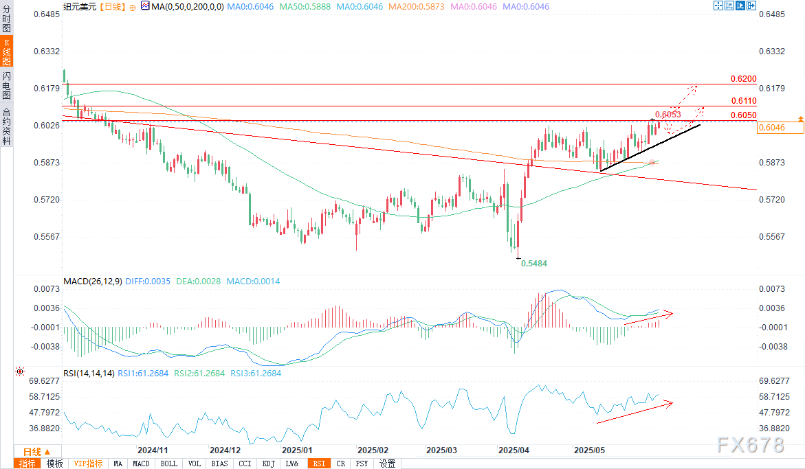 若价格能突破并收于0.6050上方,可能形成看涨结构。多头可在该水平上方建仓,下方设置止损?;?。0.6110是短期阻力位,若升破这一水平,纽元可能向0.6200迈进,这是近年来纽元多次在其上下方“争夺”的另一关键水平。