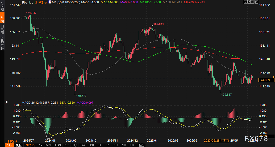 美元兑日元日线级别呈现空头排列:汇价已跌破50日均线,且100日(147.808)与200日均线(149.411)形成死亡交叉,中期趋势偏弱。若144关口失守,下方支撑将考验3月低点142.50区域。