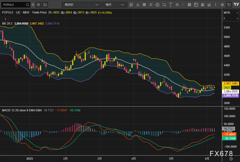 Pepperstone激石——周一(6月9日),马来西亚衍生品交易所(BMD)棕榈油期货延续震荡格局,主力8月合约收盘报3925林吉特/吨,日内涨幅0.2%,技术面呈现布林通道中轨附近胶着状态。日内行情主要受大连及芝加哥植物油市场联动影响,但交投情绪谨慎,市场焦点转向明日即将公布的马来西亚棕榈油局(MPOB)5月供需数据。