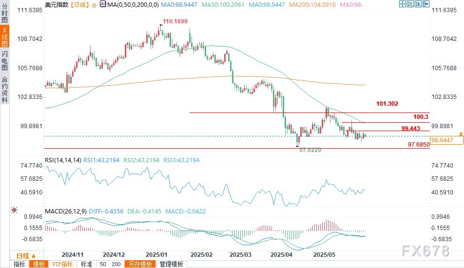 Pepperstone激石——周一(6月9日),美元指数(DXY)小幅下跌,从周五的反弹高点回落,但仍高于98.351和97.921关键技术支撑位。这一温和下跌反映出美元动能的暂时休整,市场在中美贸易谈判于伦敦开启前转为谨慎。