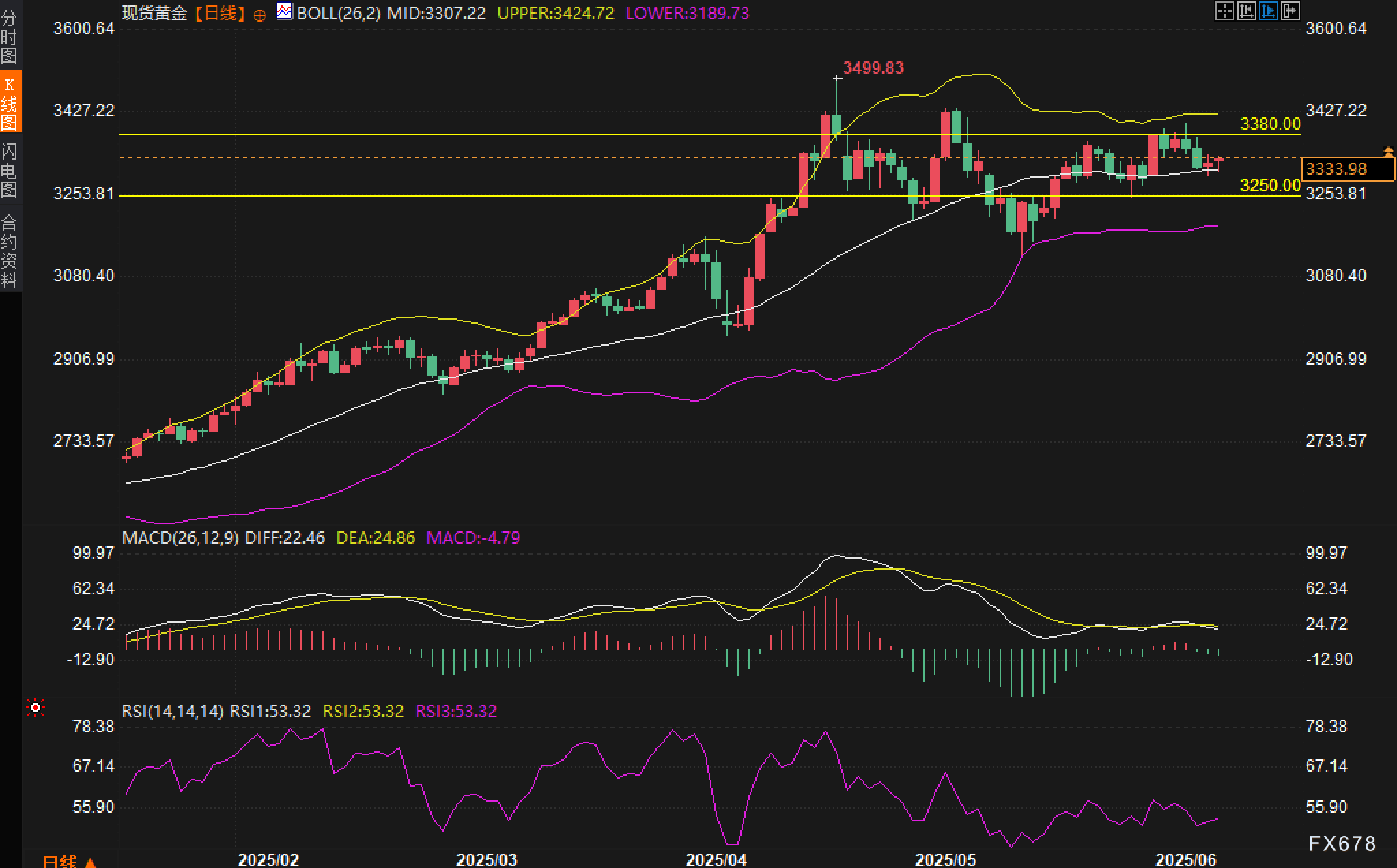 关键支撑位可见3250关口,对应前期整理平台与布林中轨下方结构,若跌破恐引发进一步下探至3189区域。上方阻力集中在3380与3425两个价位,后者为布林上轨及前高重叠区域,如突破则有望打开上涨空间。