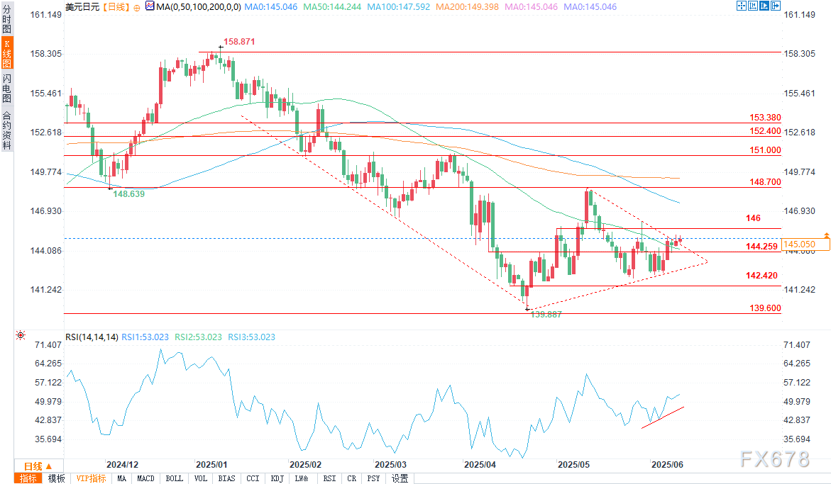 Pepperstone激石——周三(6月11日),美元/日元当前价格在144.9-145.2区间波动,较开盘有一定上涨,突破部分短期阻力,但145.3附近存在前期压力。整体看,短期偏多但超买信号隐现。