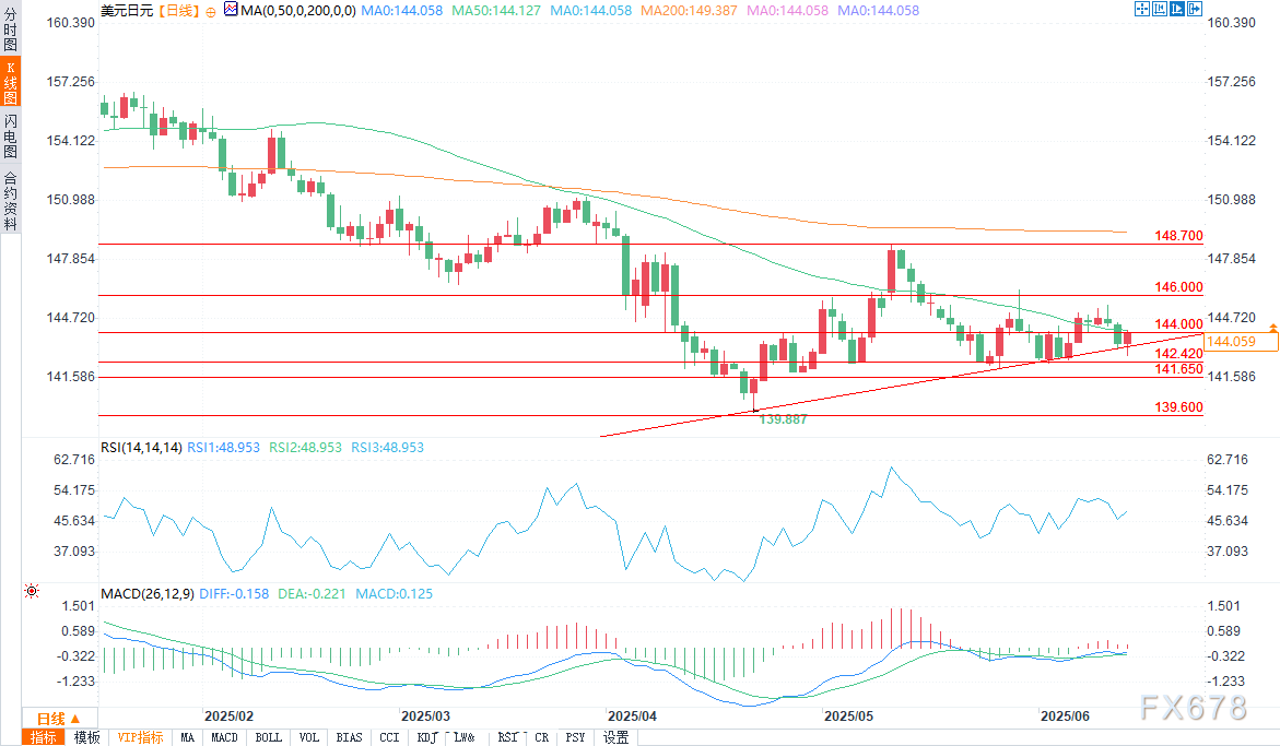 Pepperstone激石——周五(6月13日)欧盘时段,美元/欧元盘中报144.042/51,涨幅0.39%。分时图上短期多头有尝试拉升,多头力量有阶段性发力,但力量暂未完全确立优势。