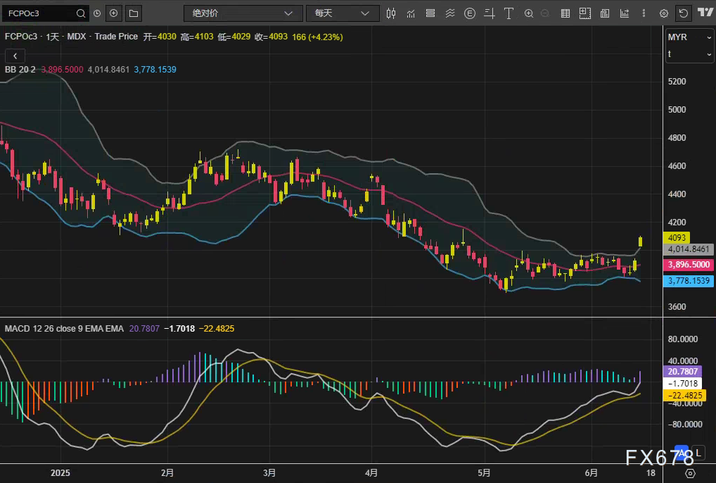 Pepperstone激石——周一(6月16日)马来西亚衍生品交易所(BMD)棕榈油期货主力合约FCPOc3(9月交割)延续强势,收盘大涨171林吉特,涨幅4.36%,报4093林吉特/吨(约965.79美元/吨),创近期新高。这已是该合约连续第三个交易日上涨,受到芝加哥豆油价格飙升及国际原油价格走强的双重提振。本文将结合最新基本面、消息面及机构观点,深入剖析棕榈油市场的新变化及未来趋势,为专业交易者提供逻辑严谨的市场洞察。