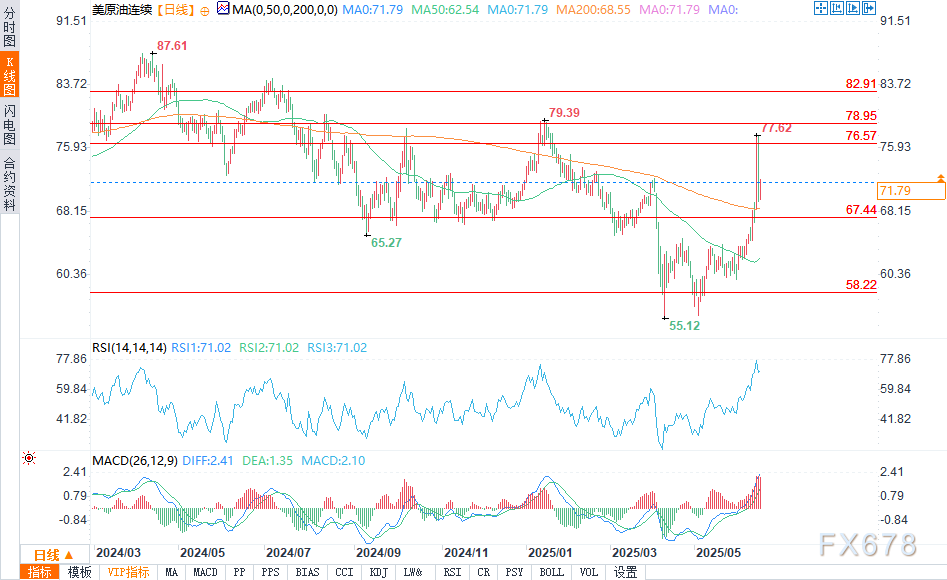 Pepperstone激石——周二(6月17日)欧盘时段,WTI原油期货上涨,从周一的大幅下跌中反弹,地缘政治风险和关键技术水平主导市场情绪。反弹在接近上周高点76.10美元处遭遇即时阻力,前方更强阻力位为76.57美元、78.95美元和82.91美元。