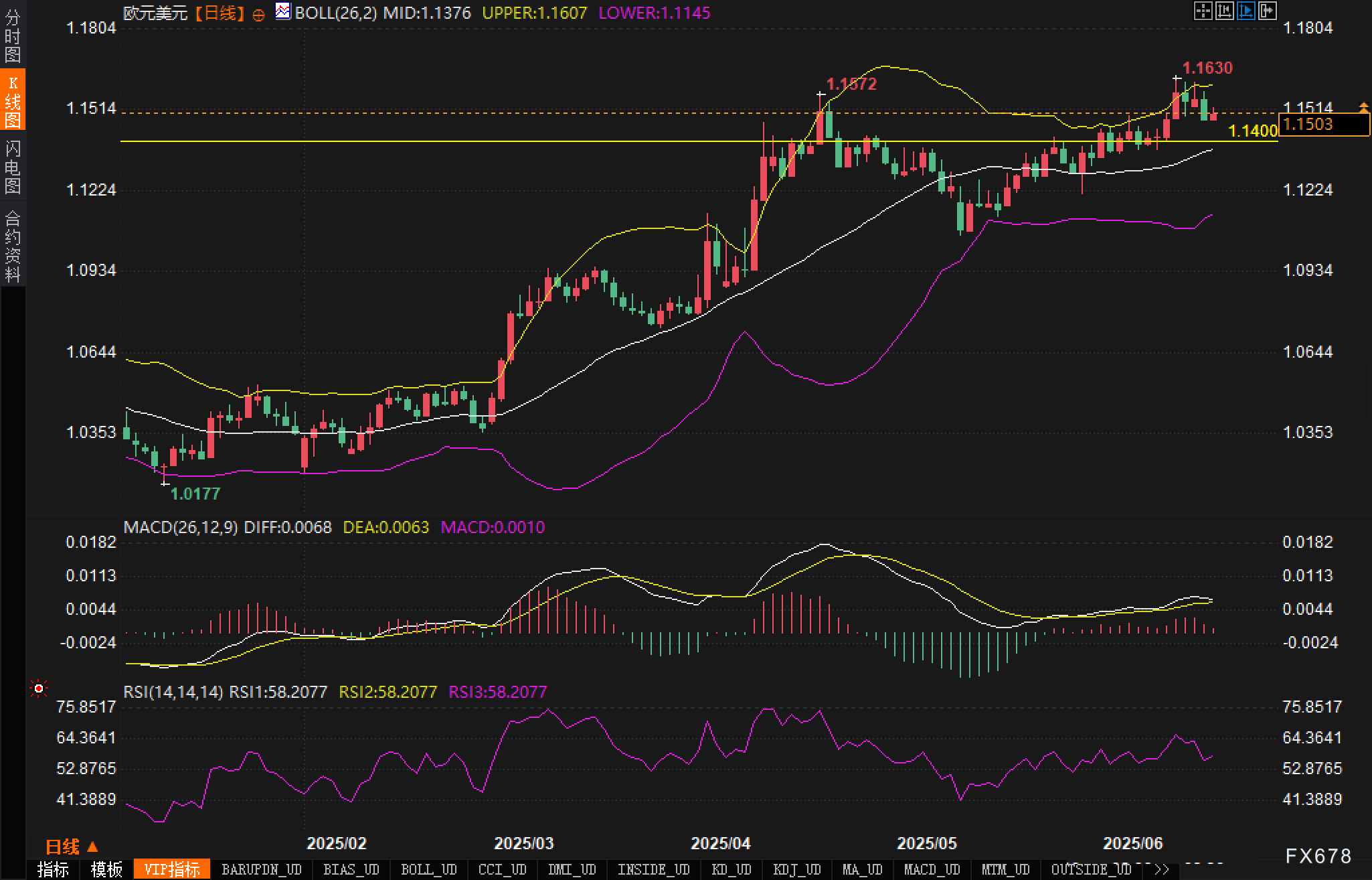 从日线图观察,欧元兑美元整体仍处于中期上升趋势中,但近期高位整理态势明显。当前价格运行于布林中轨上方,且短线受阻于1.1630一线未能突破,构成阶段性顶部。MACD指标柱状图缩小,DIFF线与DEA线趋于粘合,表明动能趋弱,存在调整风险。布林带呈现轻微收口迹象,显示波动率有所收敛,后市或将进入震荡整理阶段。