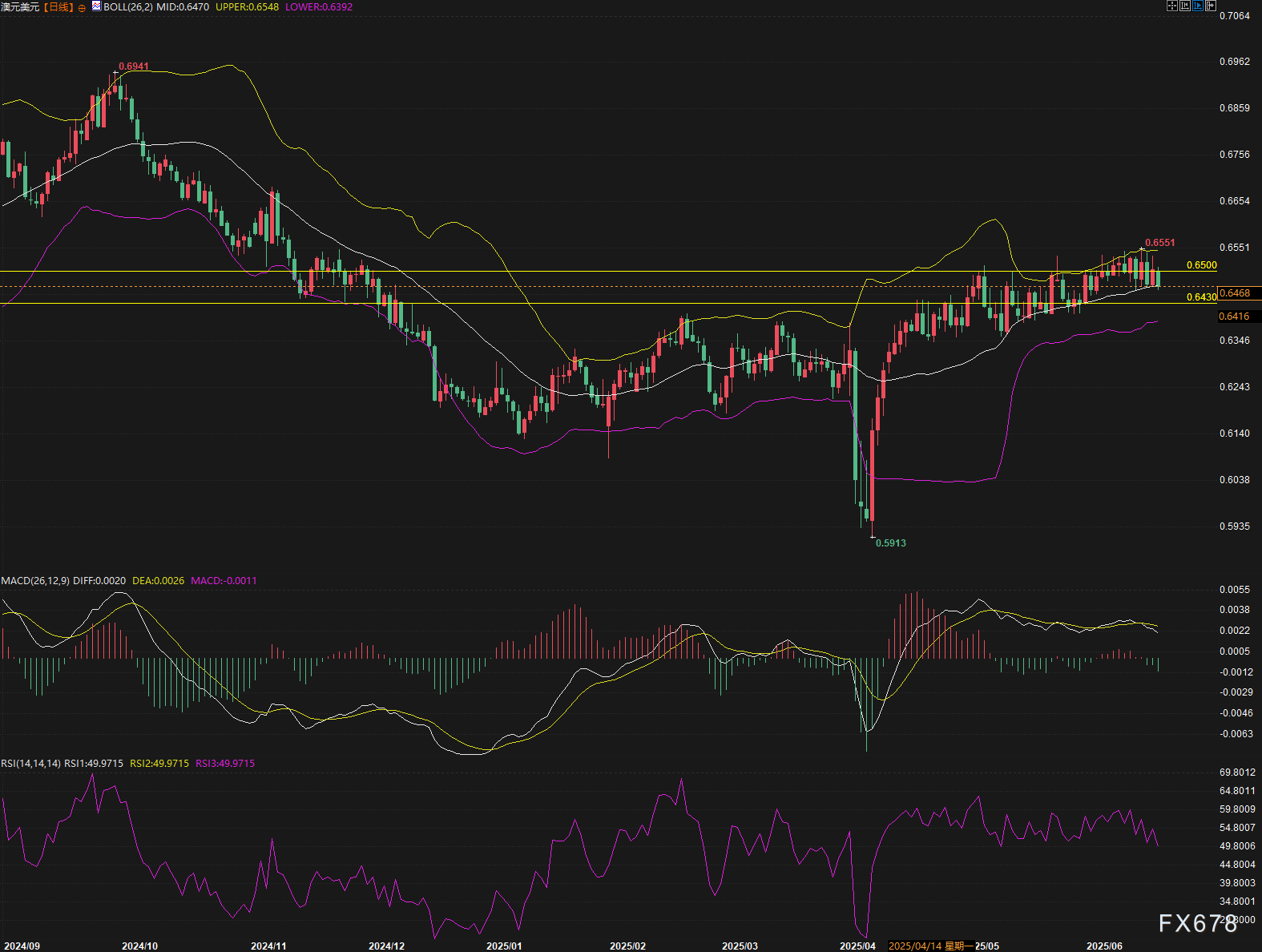 从日线图技术分析来看,澳元/美元汇价目前运行在布林带中轨附近,布林上轨位于0.655,布林下轨位于0.639水平?;慵墼诠ト苣谖衷?.6445-0.6550区间内振荡,6月3日和13日的两次探底均在0.6445-0.6455区域获得支撑。
