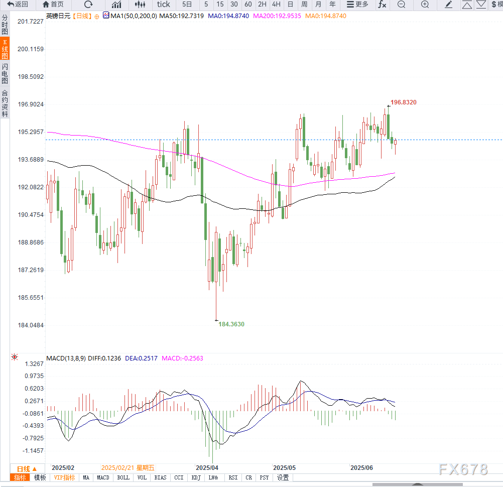 从日线级别来看,GBP/JPY自197.00高位回落后已连跌三日,现徘徊于194.45附近,价格连续收在5日均线(约195.20)下方且逼近20日均线(约194.00),显示短线空头主导。