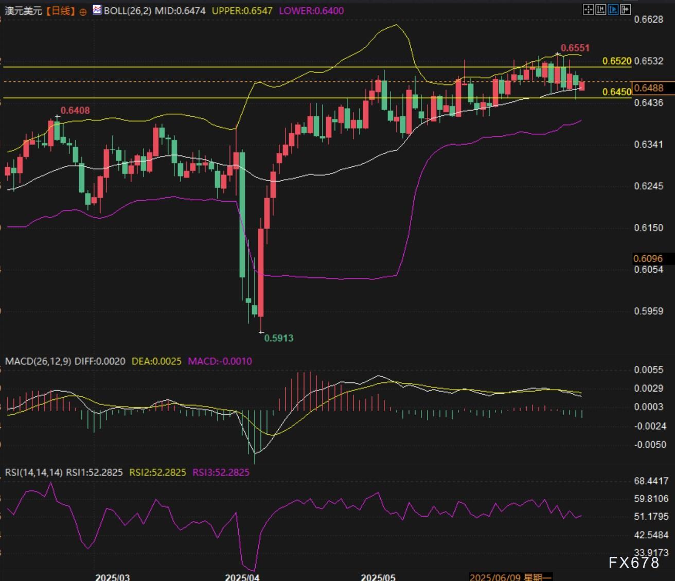 从日线图技术分析来看,澳元/美元呈现明显的上升趋势特征。价格从0.5913的低点一路反弹,目前运行在0.649附近,接近布林带上轨0.6547,显示多头趋势依然完好。
