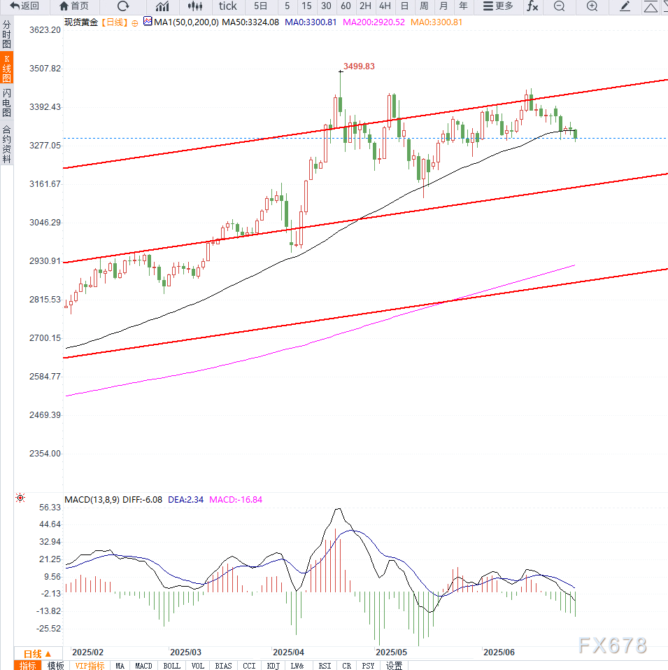 美元指数在触及三年半低点后略有反弹,主要因部分技术性回补和PCE数据前仓位调整推动。但持续的通胀回落趋势和对美联储独立性的担忧仍抑制美元中期反弹空间,从而对黄金形成一定的支撑。