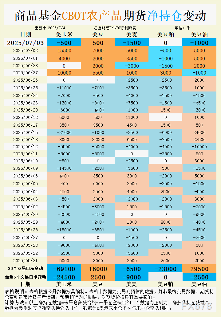 Pepperstone激石——周五(7月4日),芝加哥期货交易所(CBOT)谷物期货市场在本周最后一个交易日呈现分化走势,受到美国独立日假期前仓位调整、出口销售数据改善以及有利天气预报的综合影响。大豆和豆粕期货因空头回补和出口需求回暖小幅上涨,豆油期货则因基金抛售承压下跌,玉米和小麦期货在全球供应压力和天气利好间博弈,价格波动有限。持仓数据显示,商品基金在短期和长期持仓策略上分歧明显,反映出市场对未来供需格局的不确定性。本文将结合最新持仓变动、基差动态及基本面因素,深入分析小麦、大豆、豆油、豆粕和玉米的期货市场情绪及其对走势的影响,并展望未来方向。